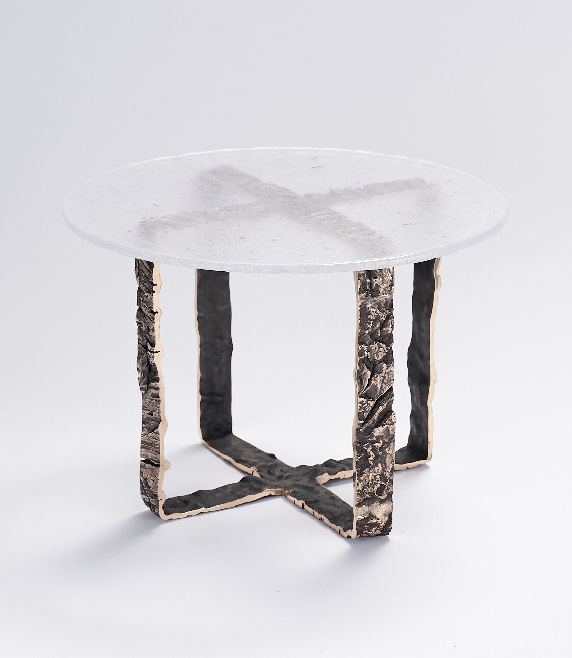 The material’s history brings the past into the present, the rugged wooden grain immortalized in metal. Each slice is unique, nuanced reflections of light in deep gray and black. The wood lives on in the metal object: deep black with light reflections, nuanced edges.