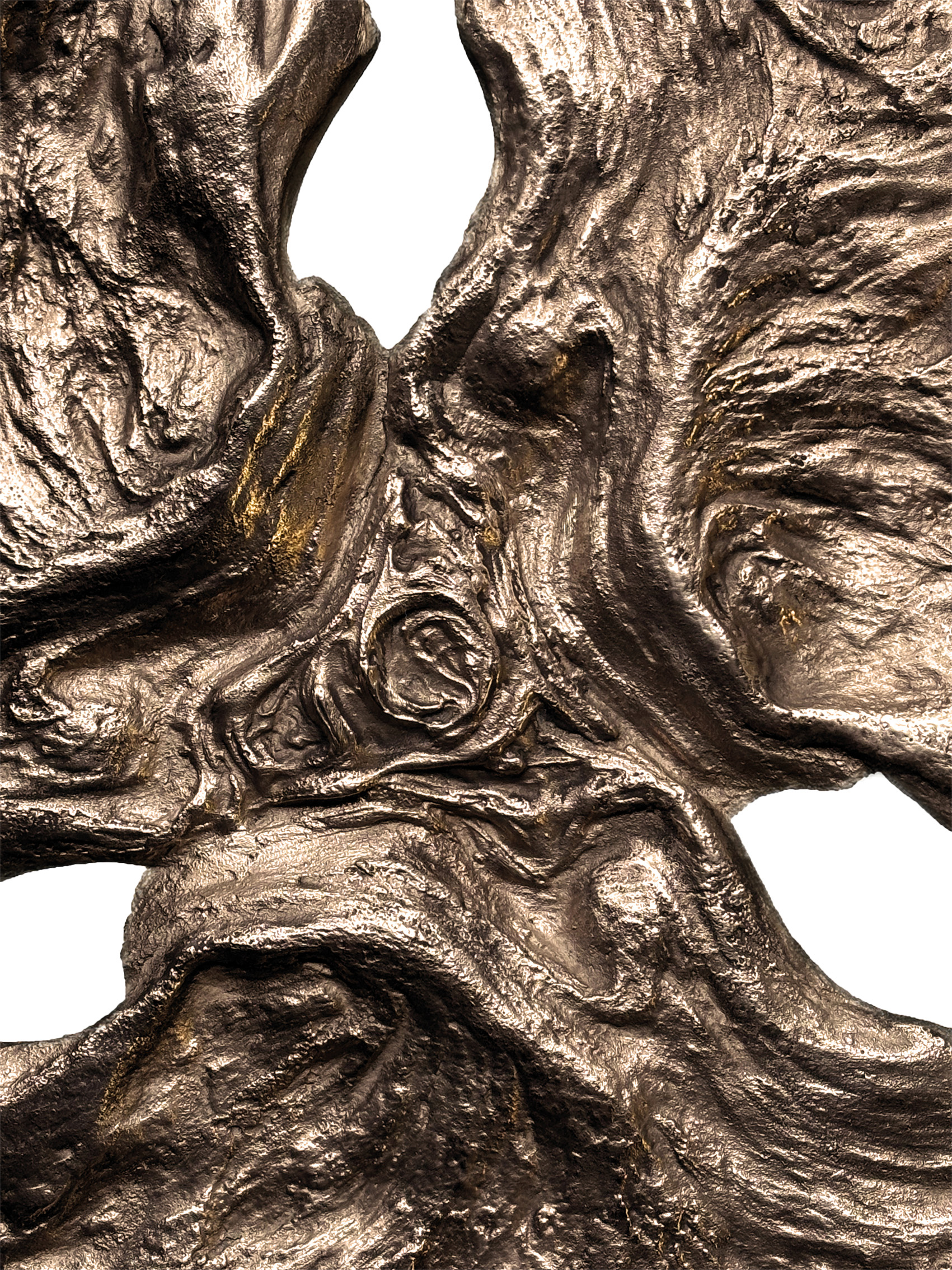 Irene Ganser’s fascination for the structure of natural materials is mirrored in the ancient grain of the long weathered wood shaped in the three leaves of the lush clover from the high pastures above the city, standing for good fortune and the timeless message of the Trinity.